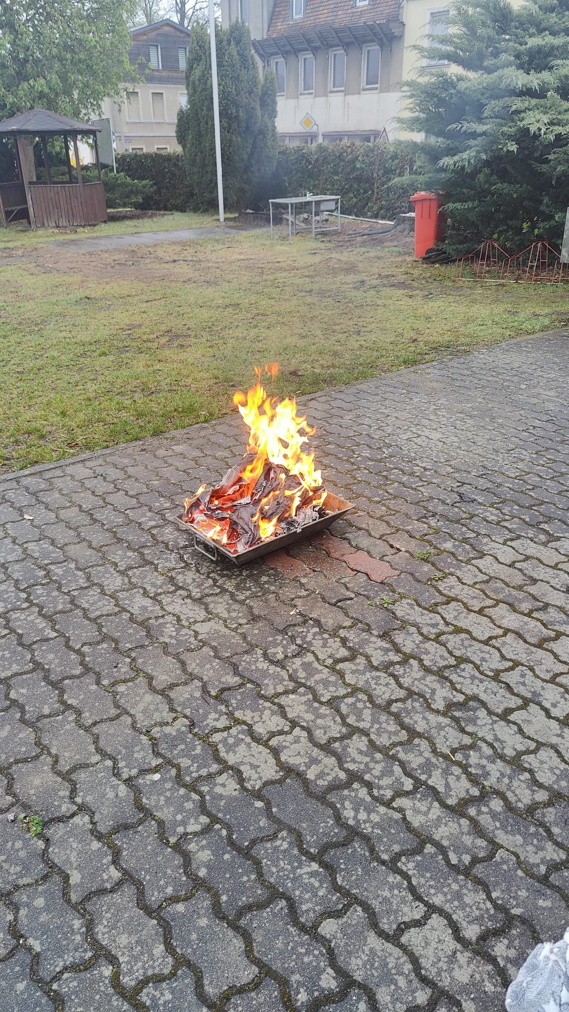 Am Wochenende hatten die Kinder eine Hausaufgabe bekommen: Sie sollten verschiedene brennbare Materialien von zu Hause mitbringen. Diese wurden am Montag gemeinsam ausprobiert. In einer Schuttmulde wurde unter Aufsicht ein kleines Feuer entzündet. Nacheinander konnten die Kinder ihre Materialien ins Feuer legen und genau beobachten, wie unterschiedlich sie brennen.