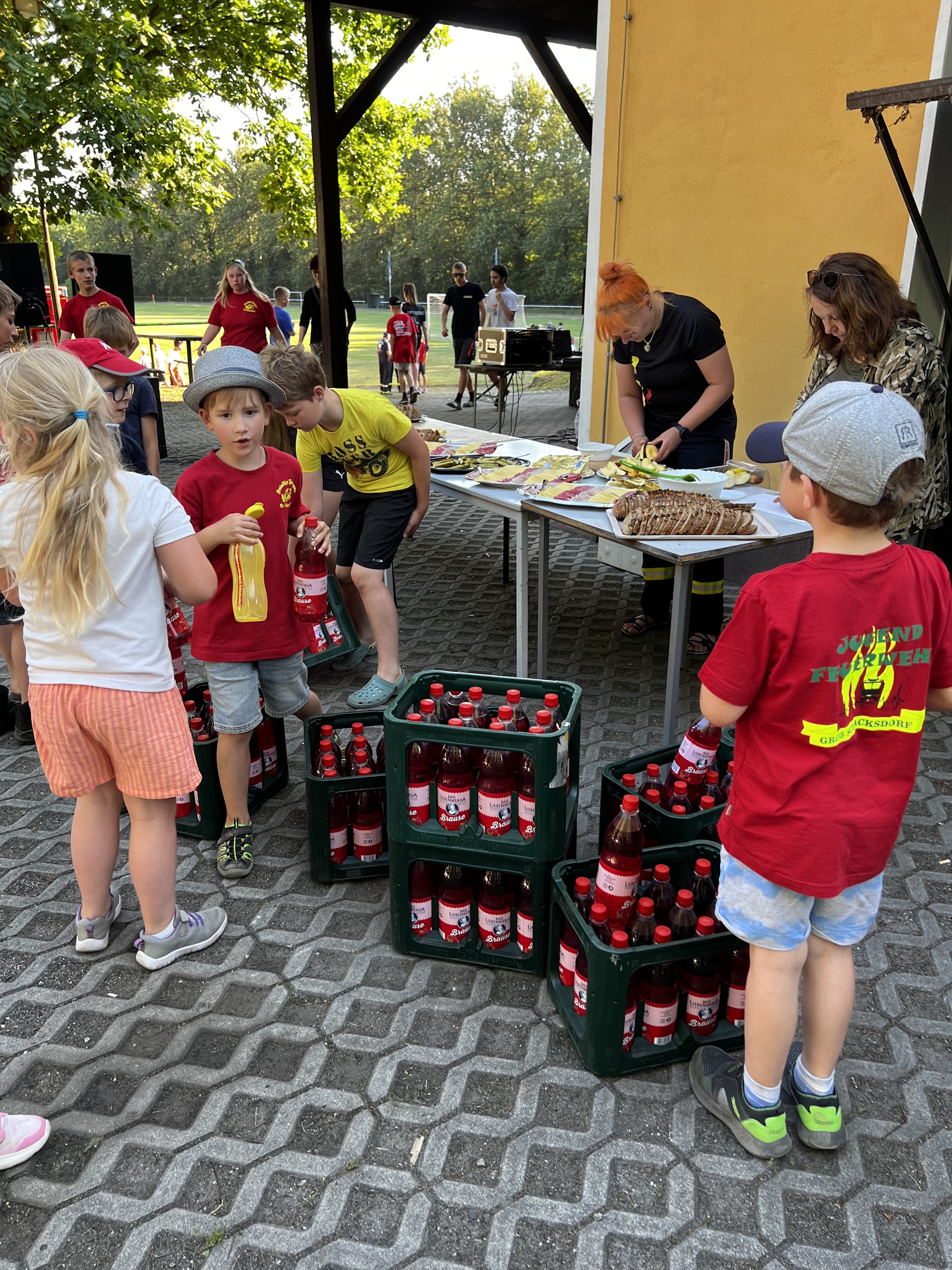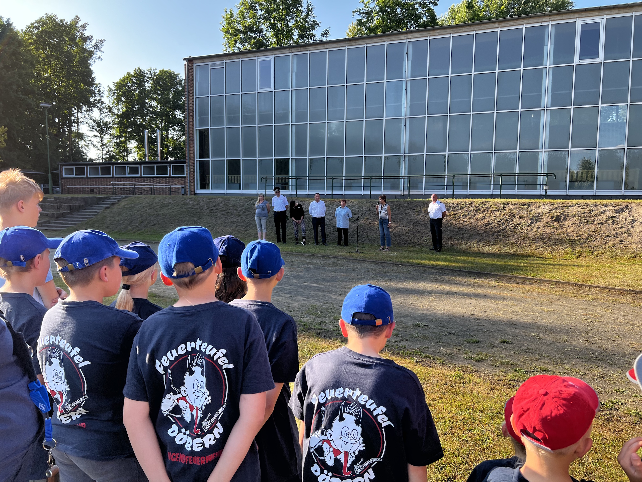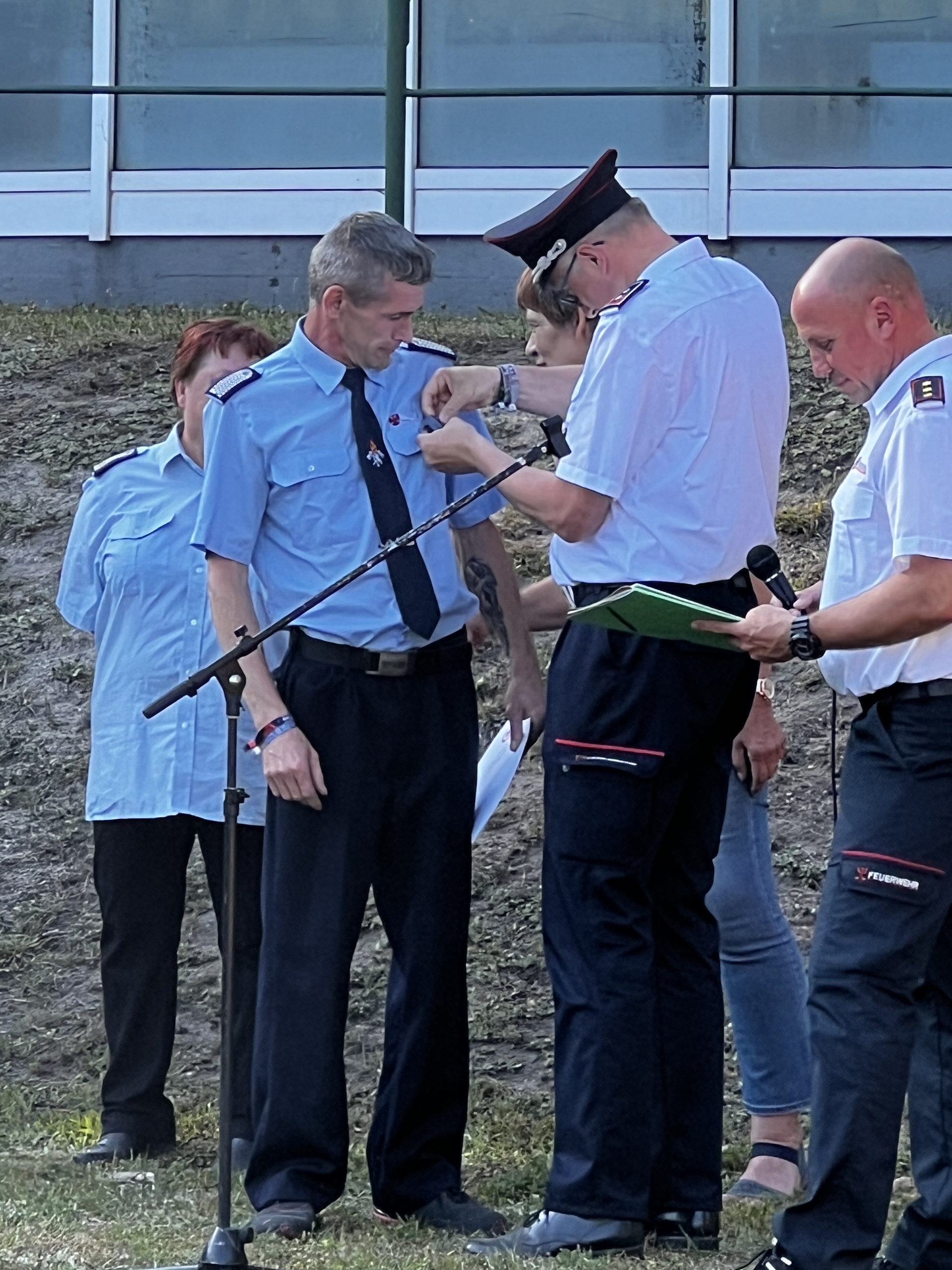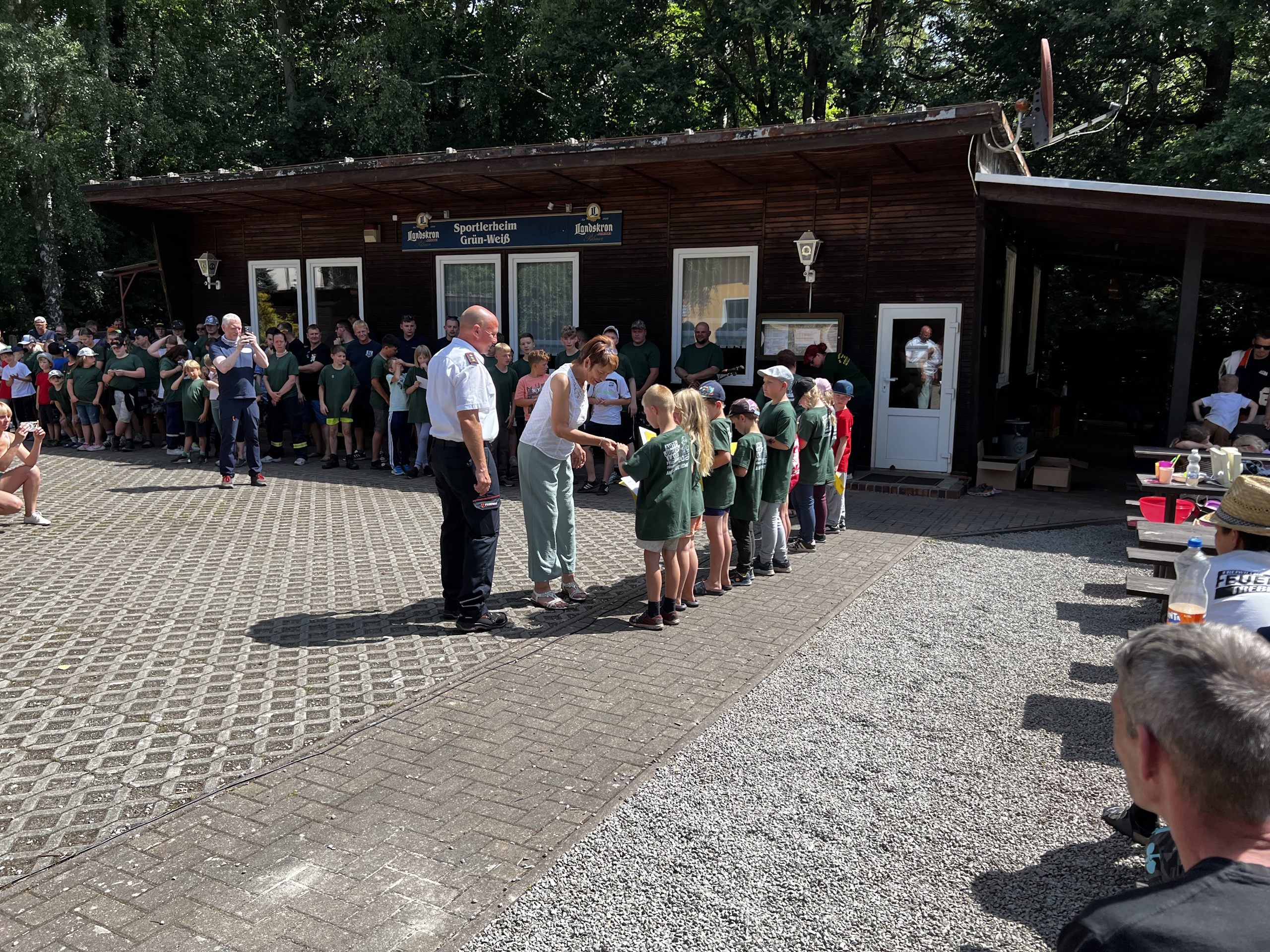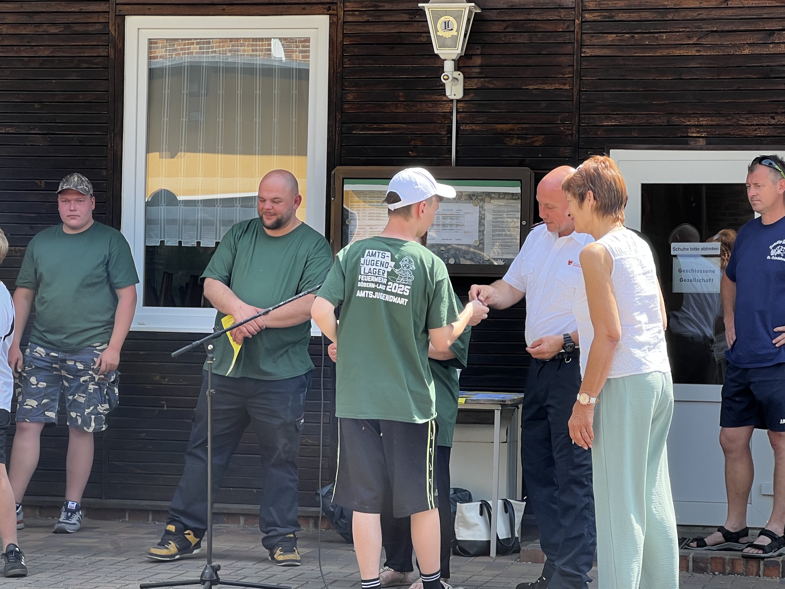 Ein besonderer Dank gilt der Sparkasse Spree-Neiße, die für die jungen Teilnehmerinnen und Teilnehmer 11 Kisten rote Brause sponserte – eine spontane Geste, die bei den Kindern für große Begeisterung sorgte und von allen mit Freude angenommen wurde. Im Rahmen der Eröffnung wurden außerdem zwei zentrale Personalentscheidungen bekannt gegeben: René Kaufmann und Clemens Meyer wurden zu stellvertretenden Amtsjugendwarten ernannt und übernehmen damit zukünftig eine noch verantwortungsvollere Rolle in der Jugendarbeit des Amtes Döbern-Land. Einen würdigen Rahmen bot der Freitagabend auch für besondere Ehrungen. Vom Kreisjugendfeuerwehrverband Spree-Neiße wurden:
