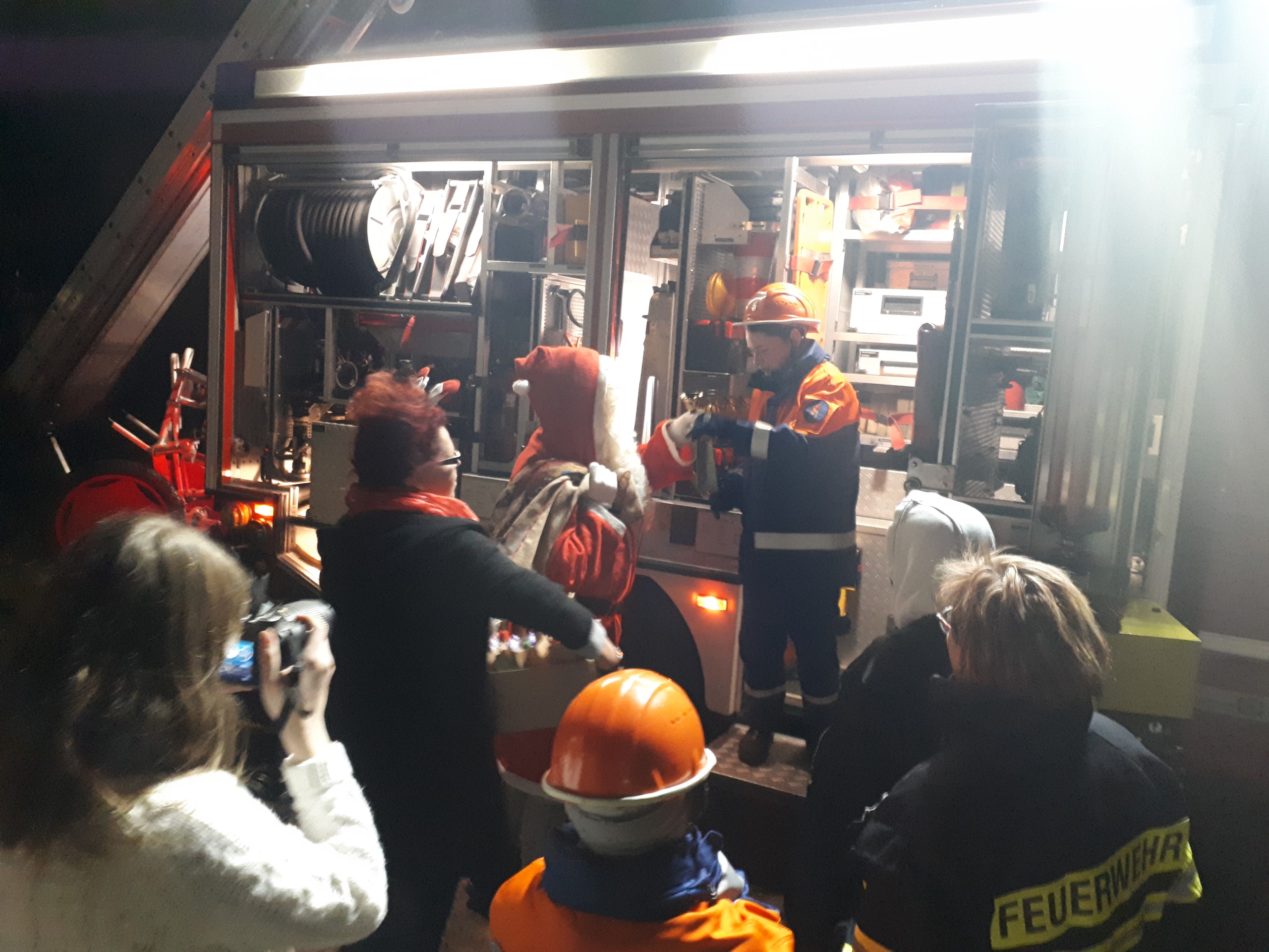 Von dieser Aktion bekam natürlich der Nikolaus Wind und konnte es sich nicht nehmen lassen, den Mitgliedern der Jugendfeuerwehr einen Besuch abzustatten. Aber natürlich kam er nicht mit leeren Händen, für ein kleines Gedicht oder ein kleines Weihnachtslied hatte er eine Kleinigkeit in seinem Nikolaussack dabei.